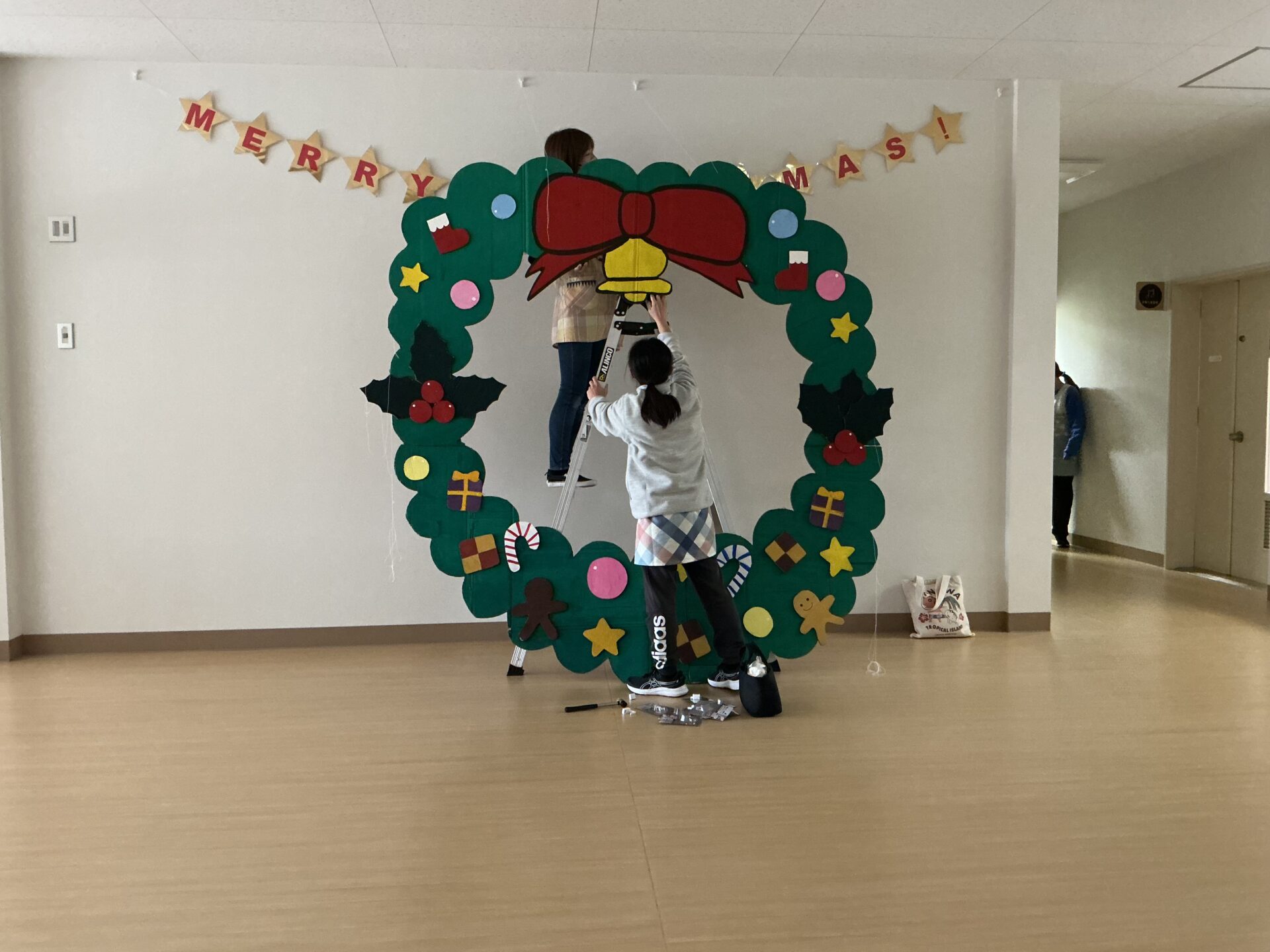 完成したリースやトナカイ、ツリーと一緒に、お楽しみ会で写真を撮ったりして