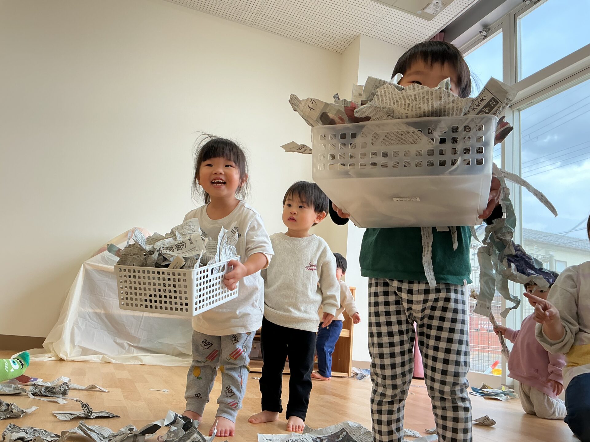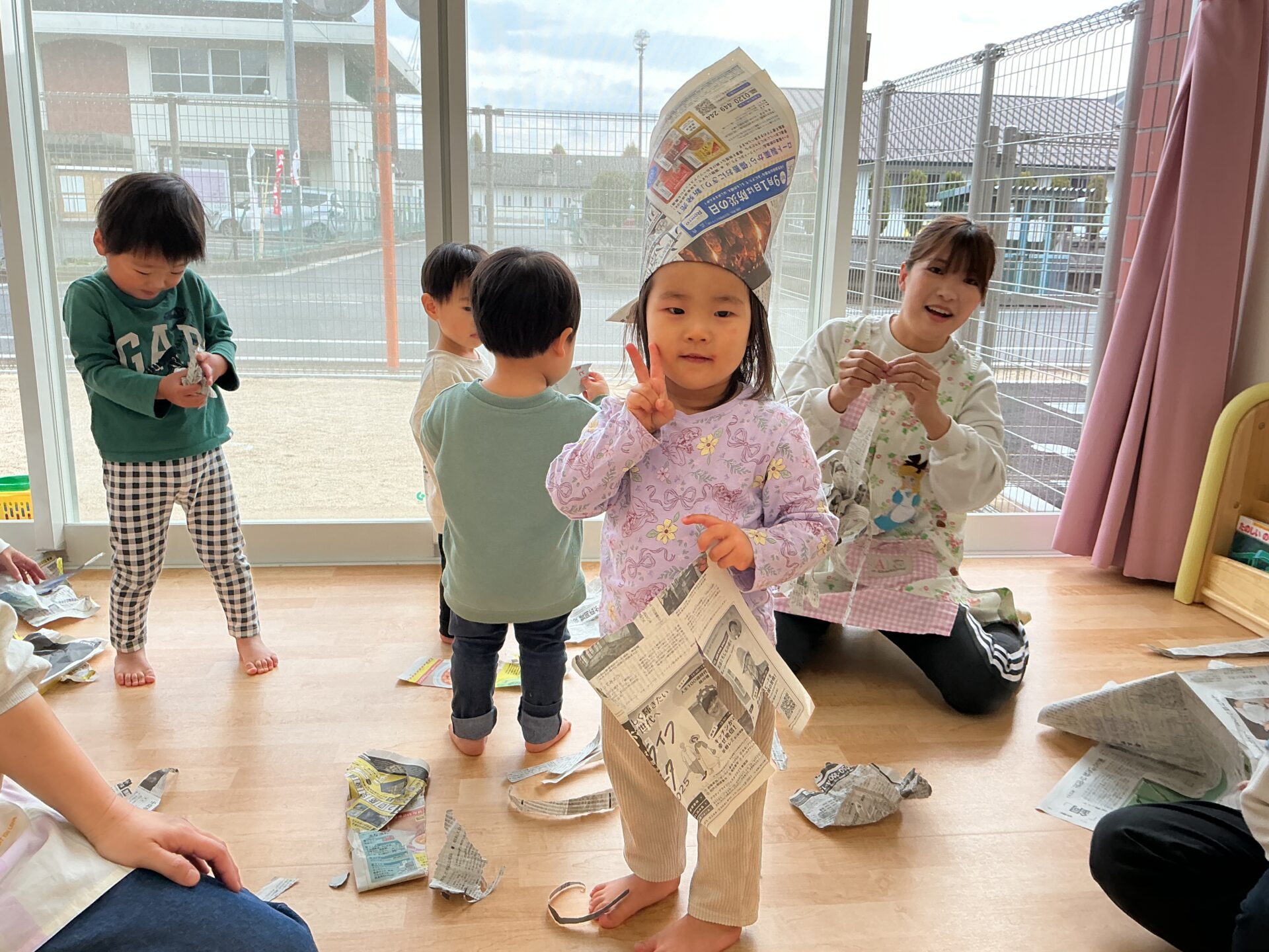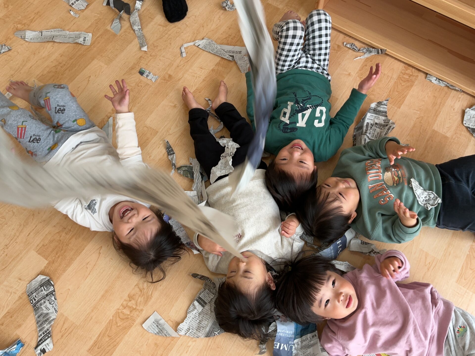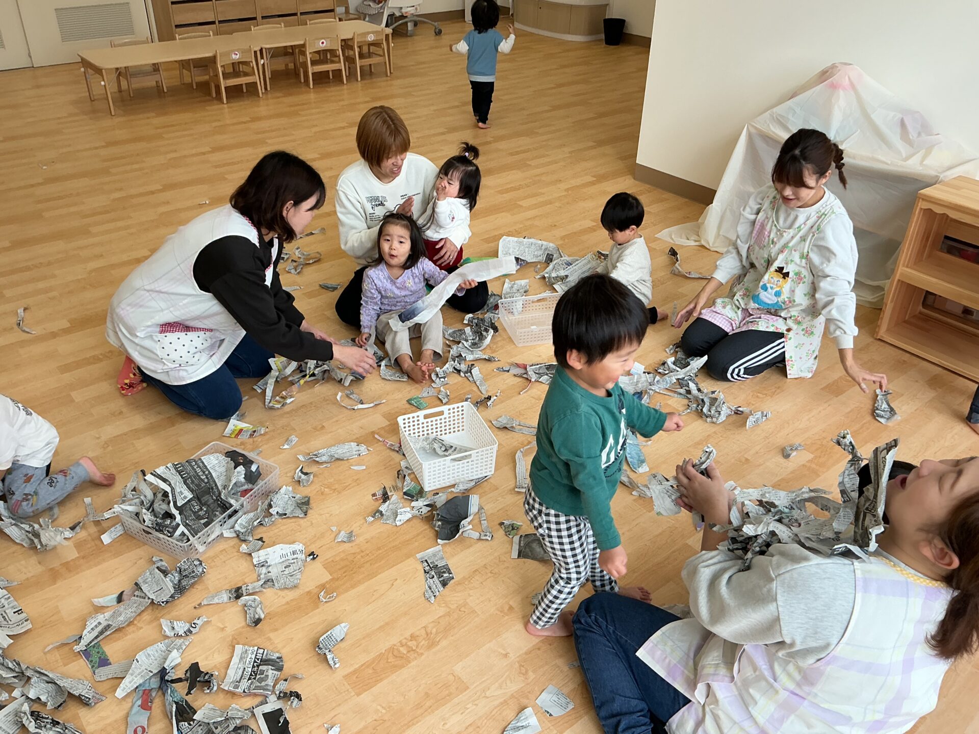 保育教諭が上から新聞をひらひら~と落とすと、手を伸ばして喜び、