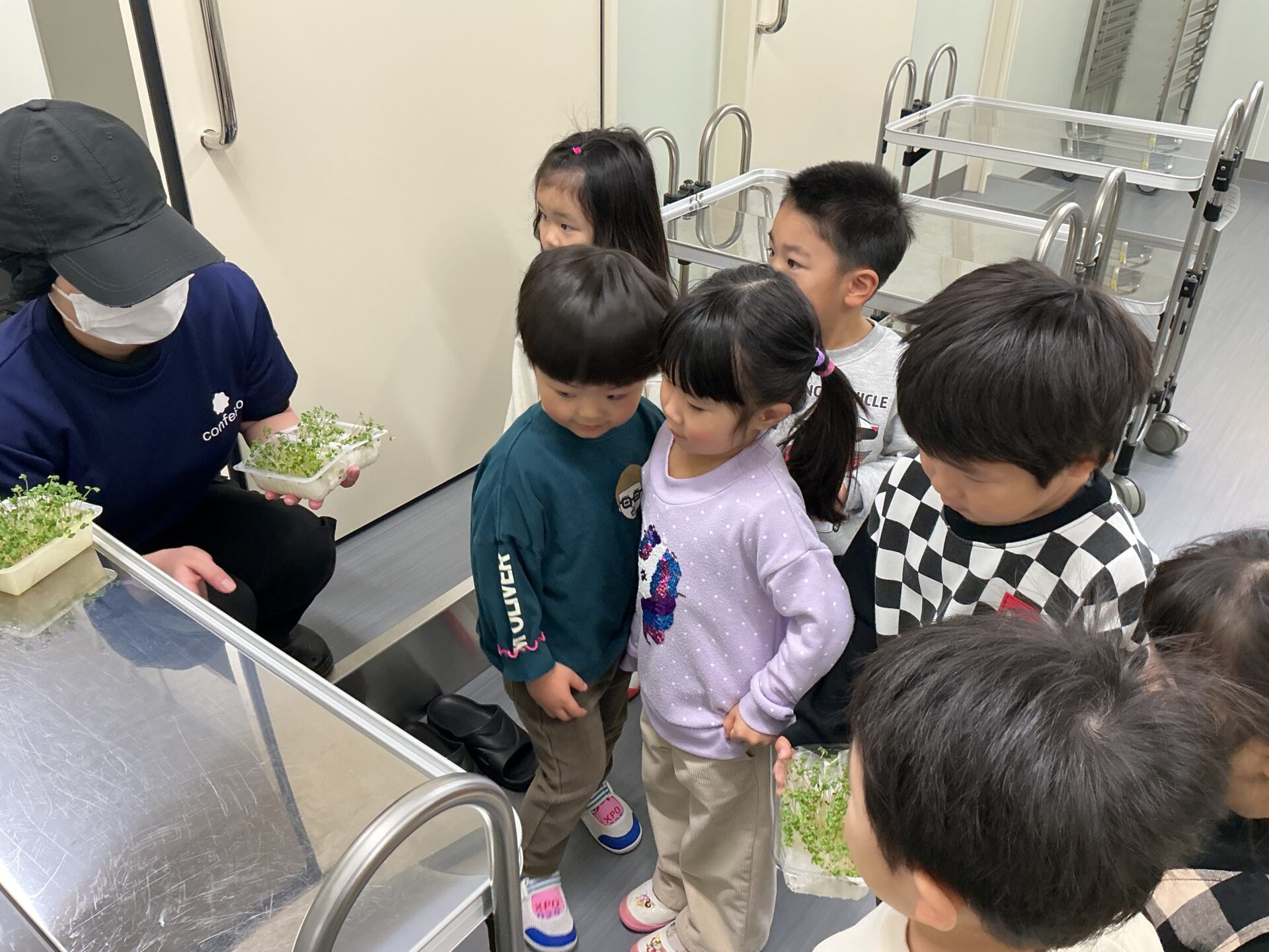 かいわれブロッコリーが食べられることを伝えると「やったぁ」と、喜ぶ子ども達。
