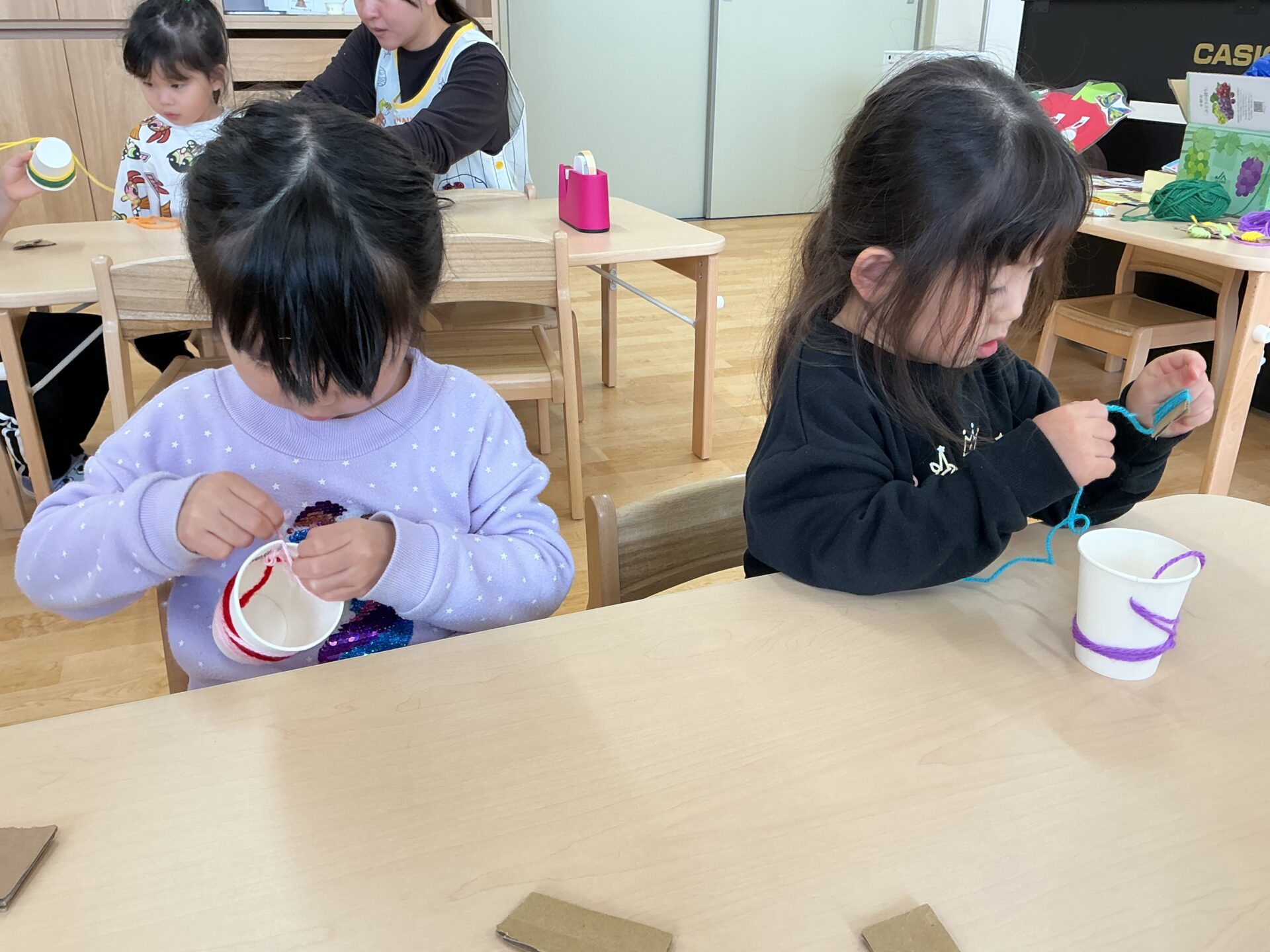 と、話しながらも、紙コップに毛糸を巻き付けました。