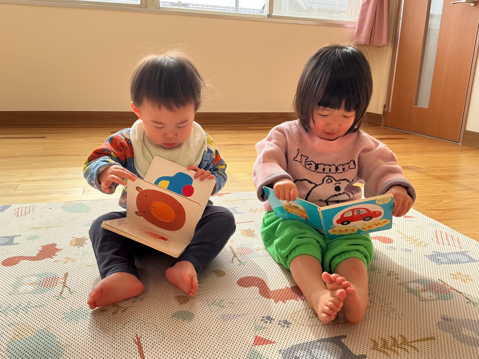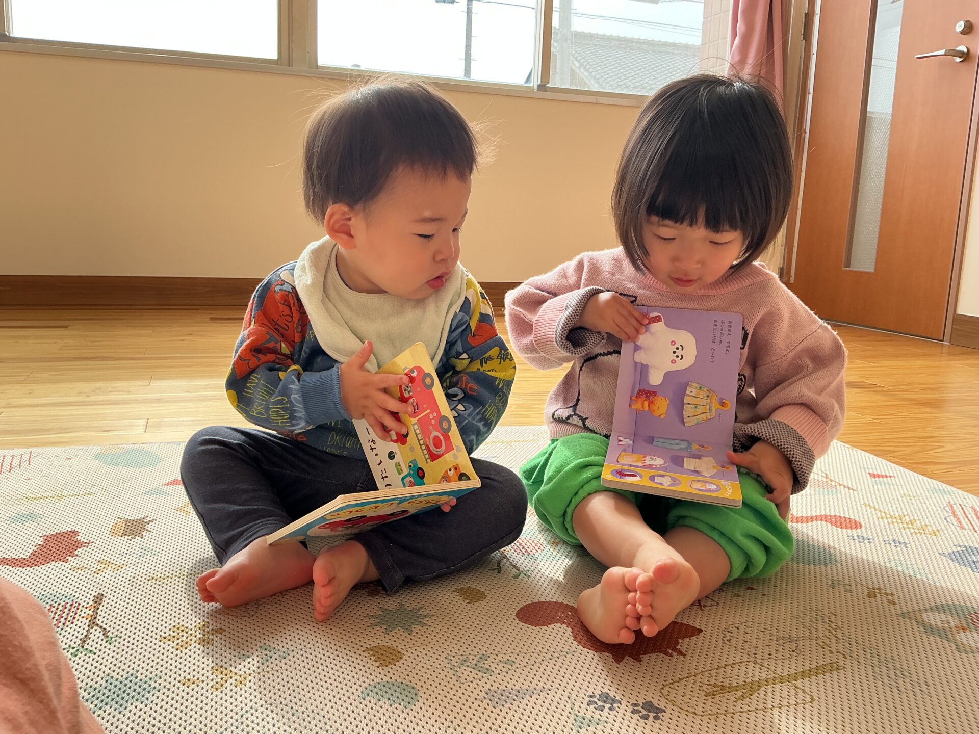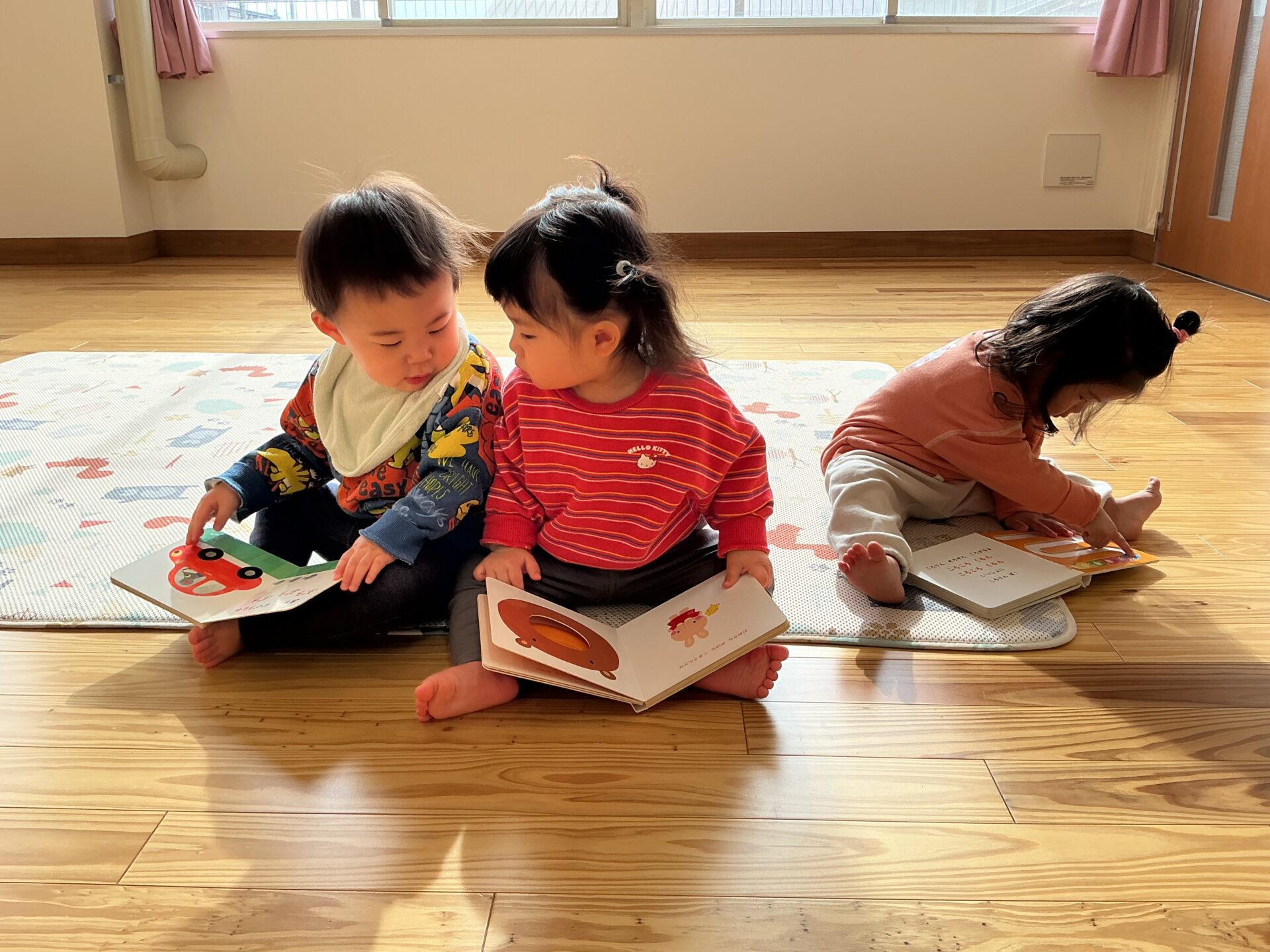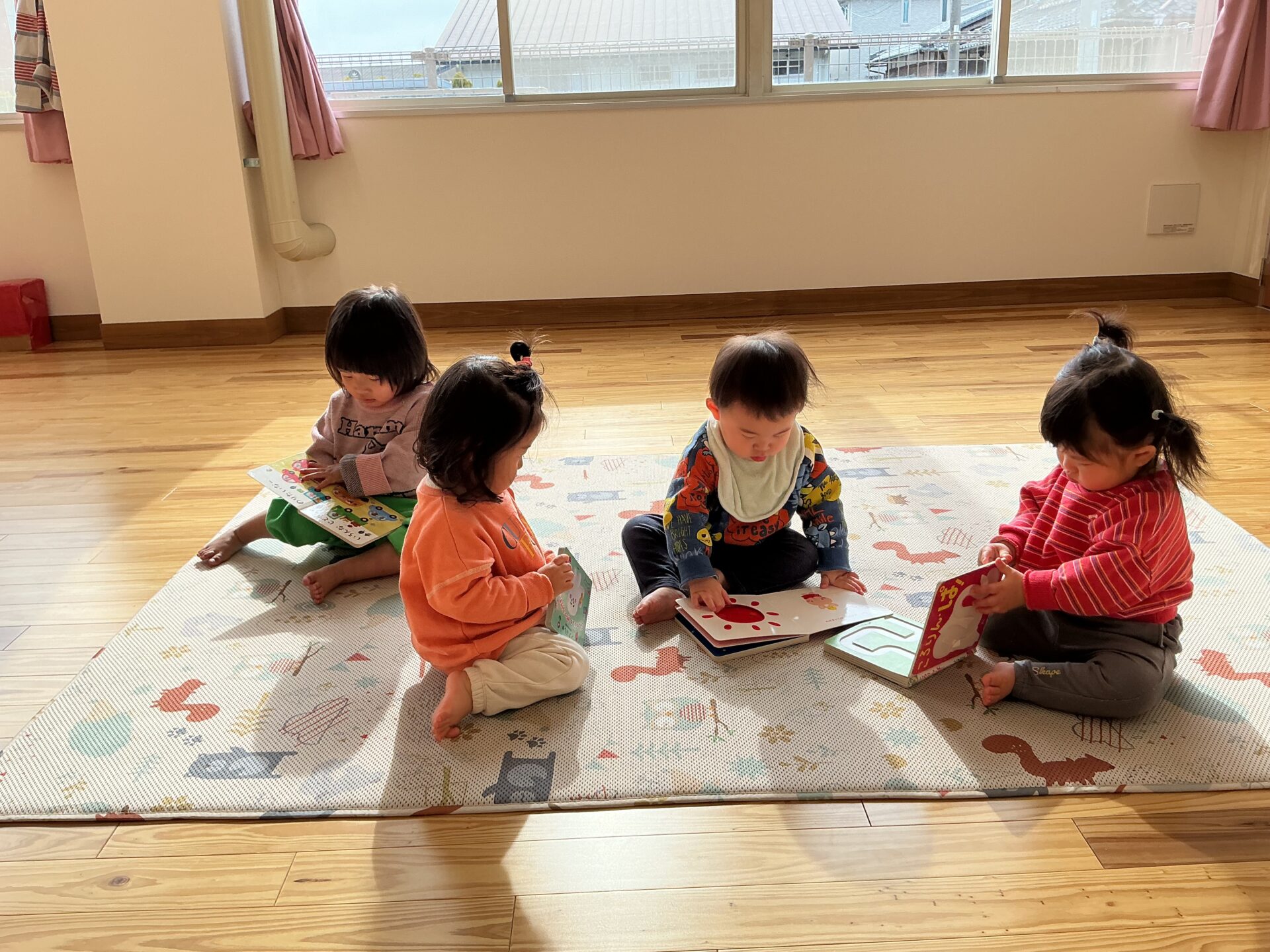広い保育室ではありますが、みんな部真ん中に集まって読む姿が本当に可愛く、保育教諭も思わず…